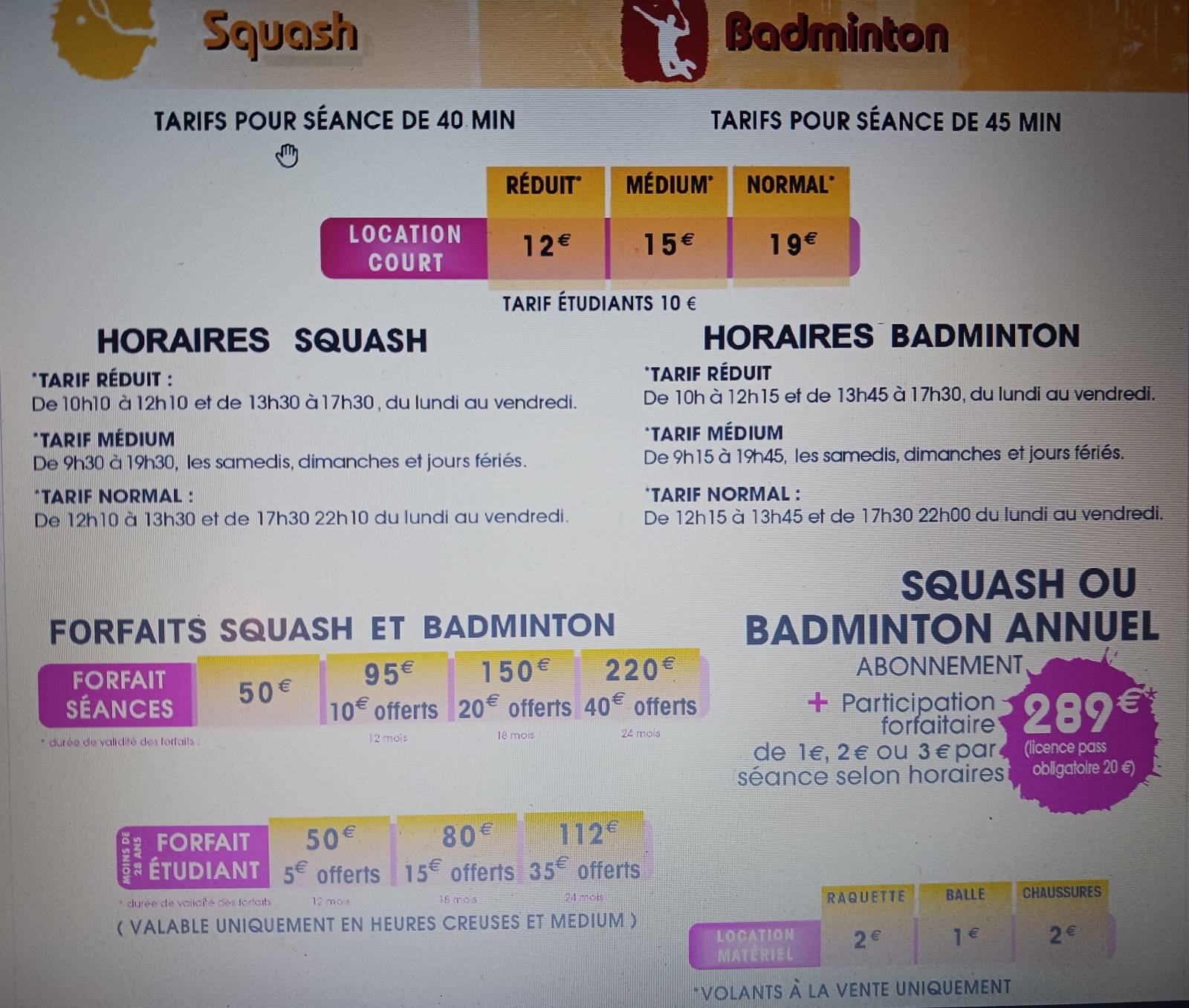 Les sessions durent 45 min pour le badminton et 40 min pour le squash.
